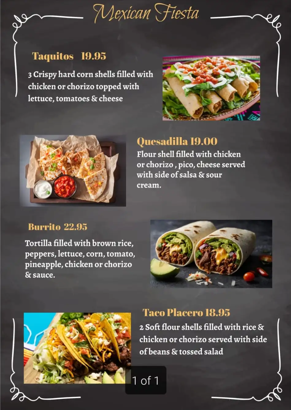 Spicy chicken or beef, sautéed onions, cheese, salsa & sour cream